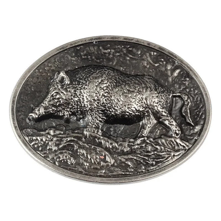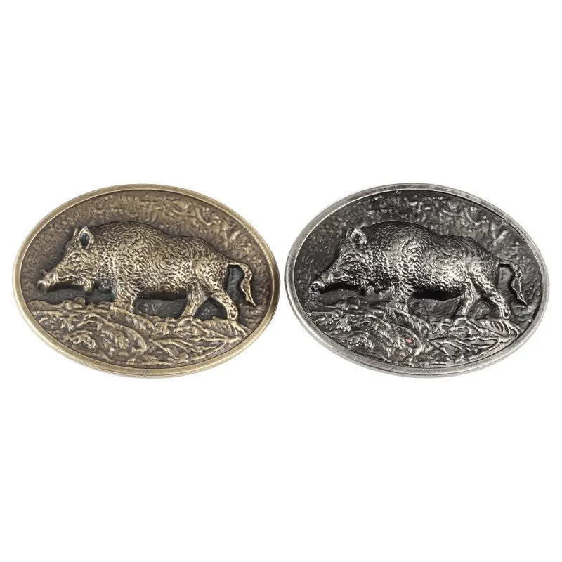 Cette boucle présente un sanglier. Elle a une superbe finition antique. Boucle de ceinture de chasseur de forme ovale représentant un sanglier, un design unique peut correspondre à une ceinture à la mode.