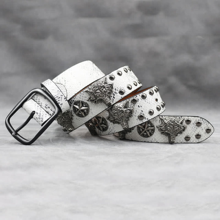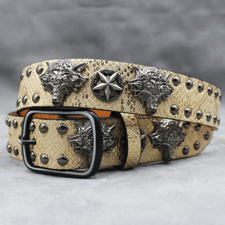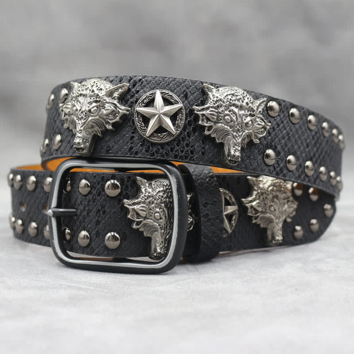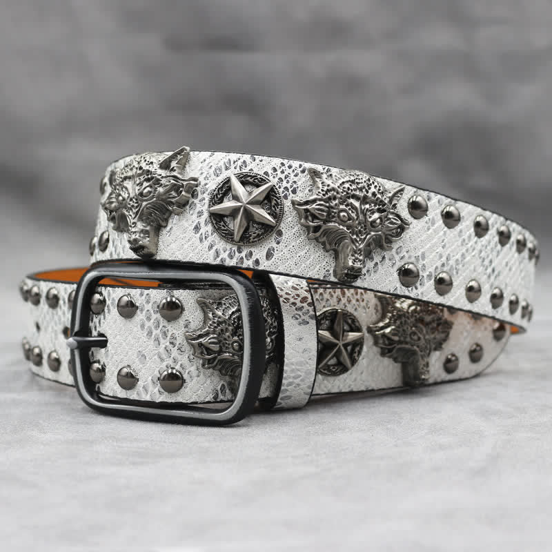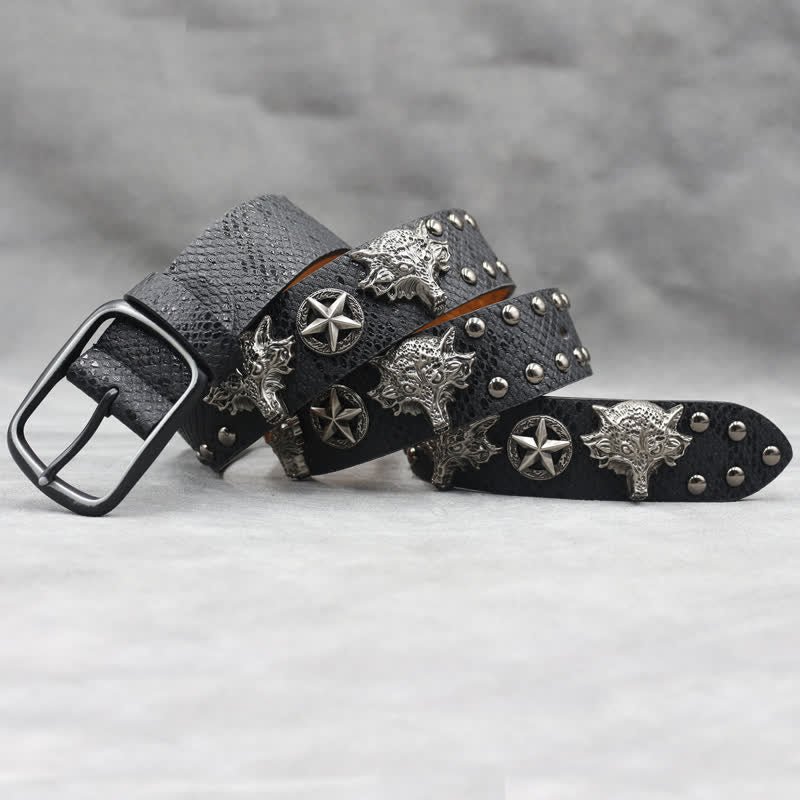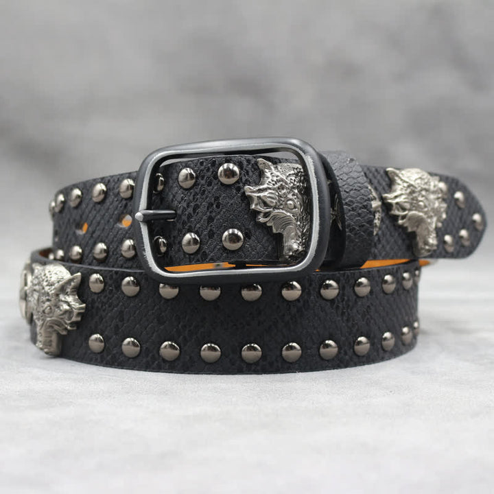 Ceinture en cuir noir à imprimé peau de serpent avec rivets tête de loup en argent antique