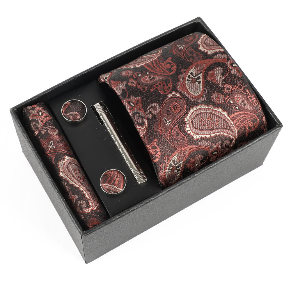 - Cet ensemble de cravate comprend une cravate, une pochette, une paire de boutons de manchette et une pince à cravate, confectionnés en polyester de qualité supérieure et en métal raffiné.