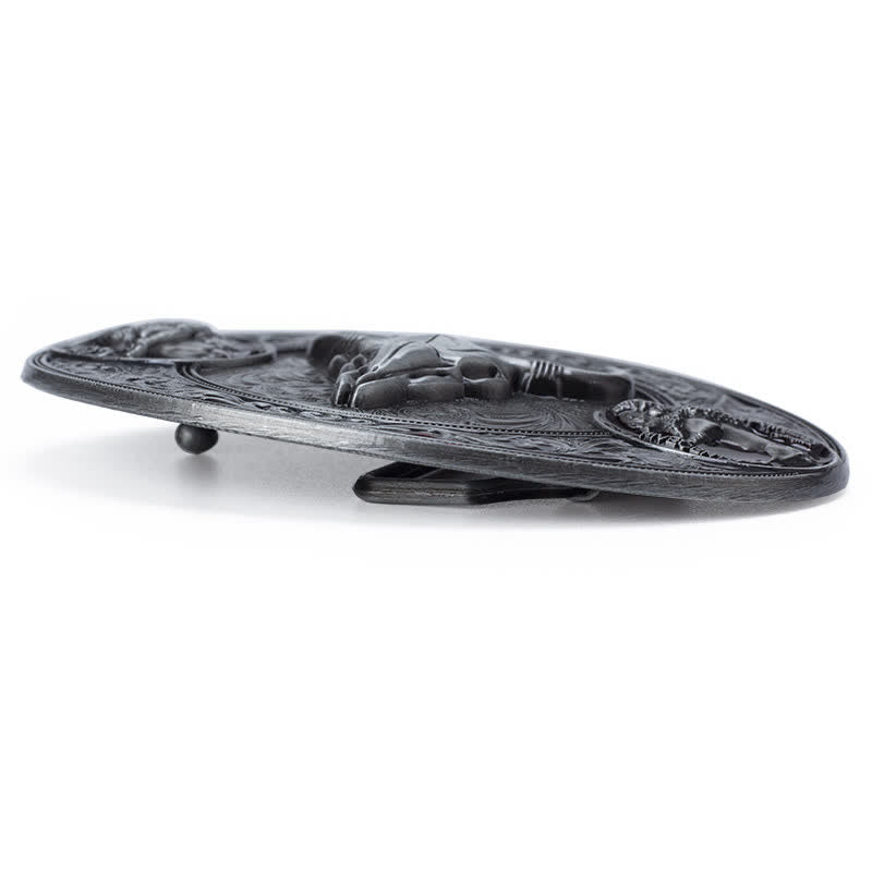 Cette boucle présente un crâne de taureau, un buffle et une tête d'Indien de chaque côté sur un fond rouge foncé. Son style distinctif injectera beaucoup de personnalité dans votre tenue de tous les jours.