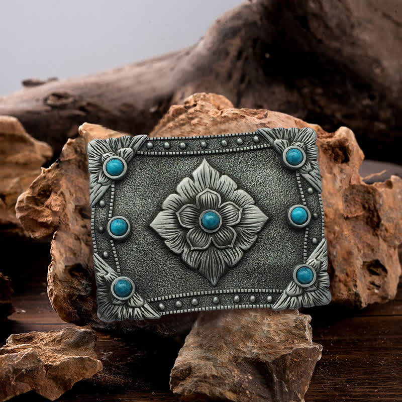 Cette boucle particulière est dotée de 7 pierres turquoise artificielles serties dans un motif floral sculpté. C'est un accessoire élégant de style occidental.