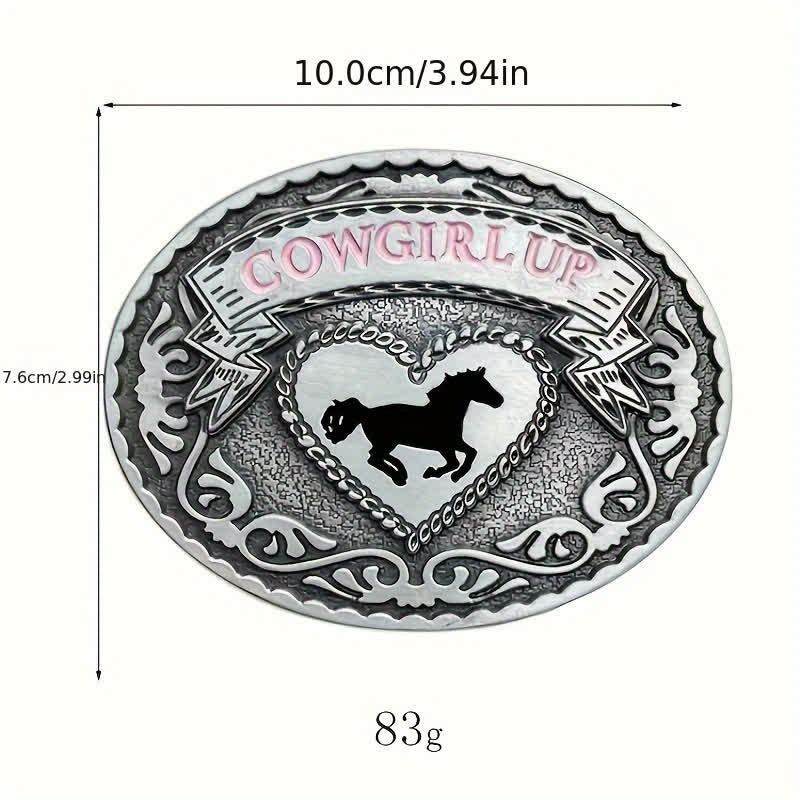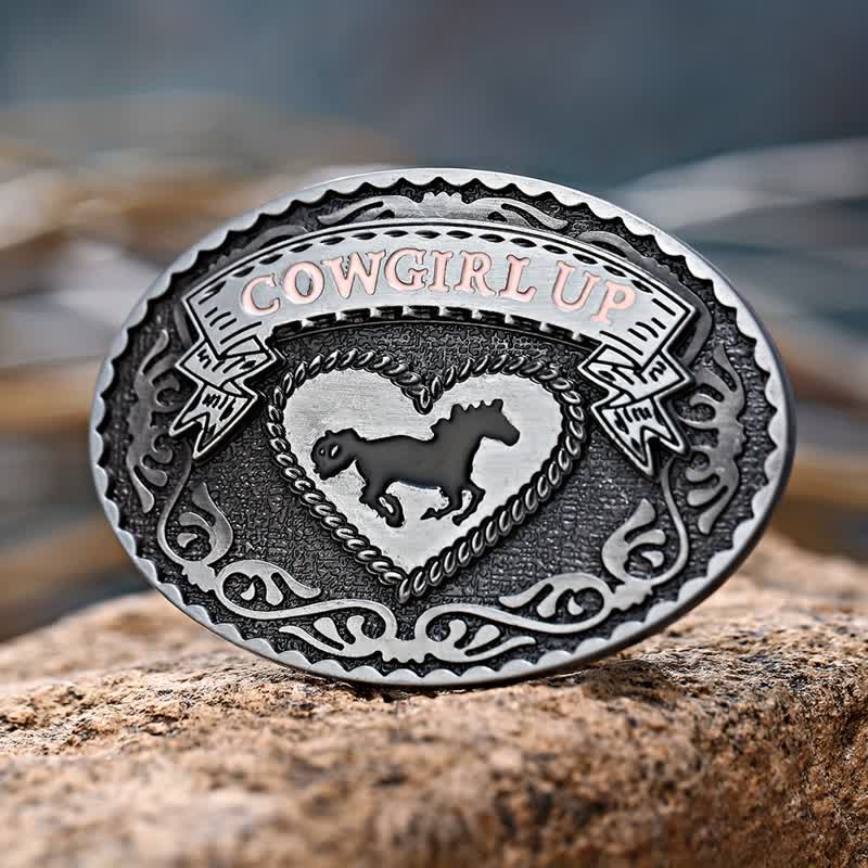 Boucle argentée foncée avec inscription florale, cœur détaillé avec la silhouette d'un cheval et une bannière rose avec le mot COWGIRL UP. Montrez votre cœur western et votre ténacité avec cette boucle.