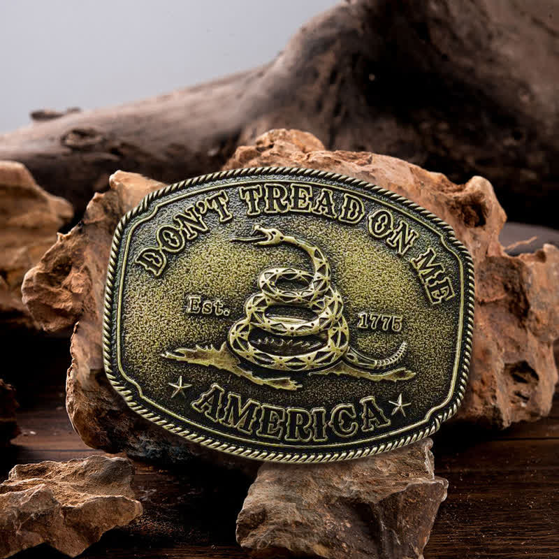 Cette boucle de ceinture de forme géométrique présente un bord lisse avec un serpent et les mots « Don't Tread On Me » sur le dessus. Cette grande boucle de ceinture fantaisie offre un style western audacieux qui complètera votre ceinture préférée.