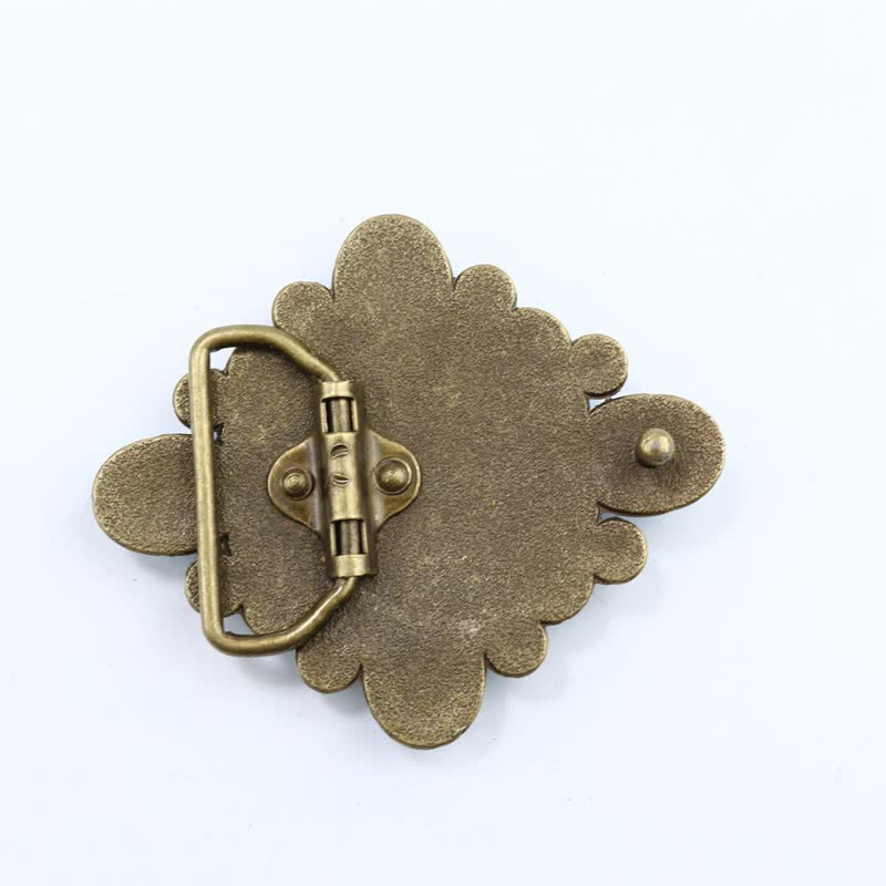Une boucle luxueuse ornée de fausses turquoises. Formé d'un alliage de couleur bronze dans un design en relief serti de fausses pierres turquoise de tailles assorties.