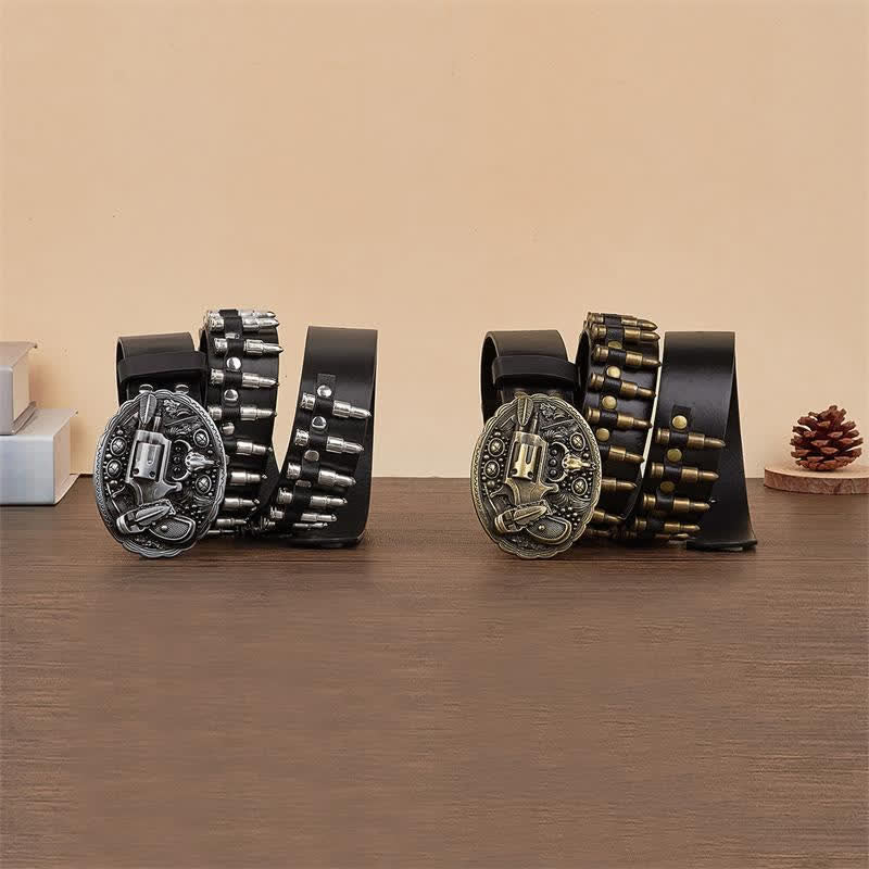Cette ceinture à rivets punk rock classique se compose d'une ceinture en cuir PU avec une boucle de pistolet 3D cool et une rangée d'incrustations métalliques en forme de balle, qui met en valeur le style de conception rock punk. Aussi bien pour les hommes que pour les femmes cool.