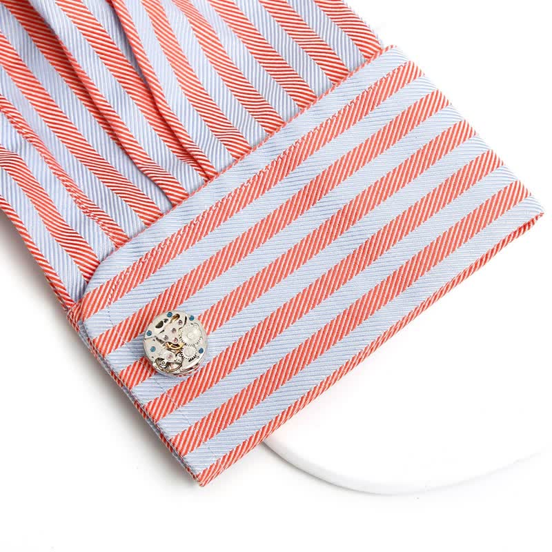 Ces boutons de manchette exquis mettent en valeur un mouvement mécanique captivant, enchâssé dans un ton argenté étincelant. Chaque petit rouage et composant est minutieusement travaillé, révélant la complexité de l'art horloger.