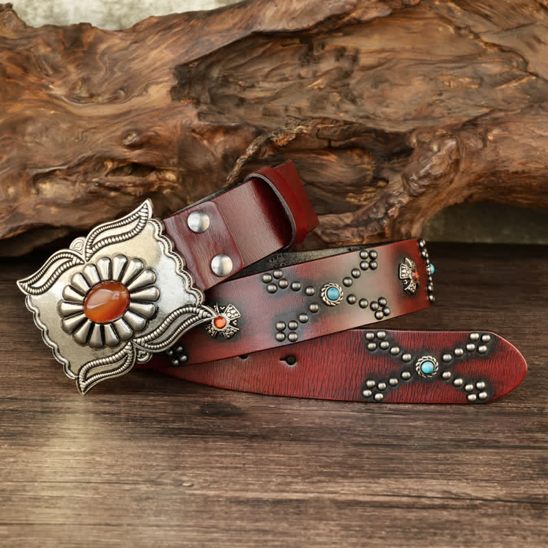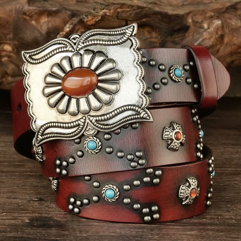Ceinture en cuir à rivets occidentale décorée de pierres précieuses colorées