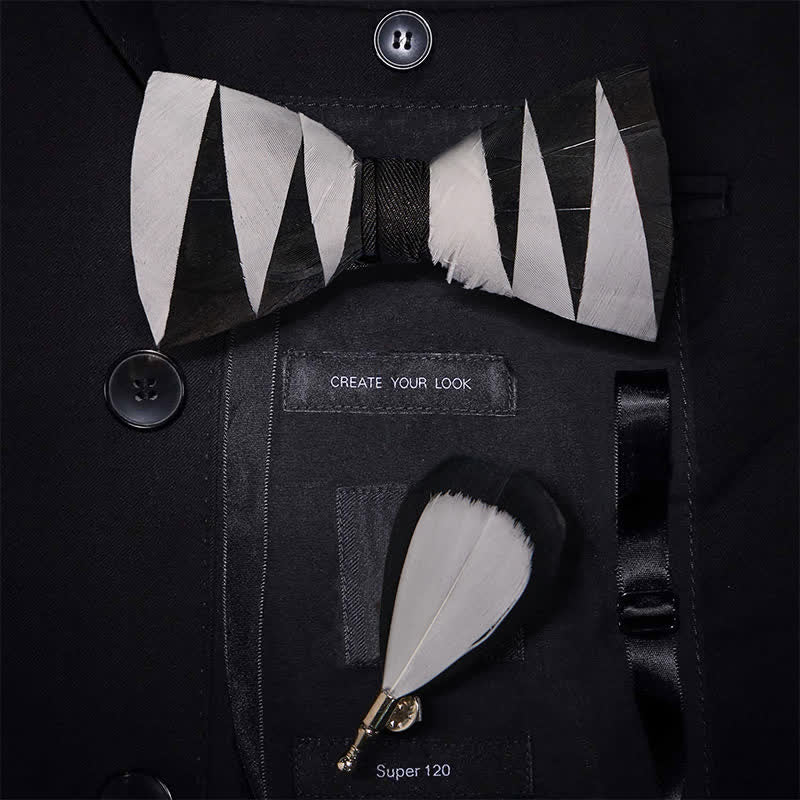 Un design entièrement en plumes, le nœud papillon blanc et noir utilise une nouvelle technique pour créer des angles parfaitement symétriques pour un style accrocheur.