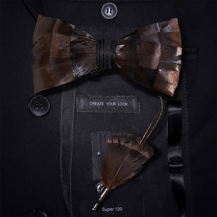 Vous cherchez une alternative au nœud papillon noir classique en soie ? Ne cherchez plus ! Ce nœud papillon est orné de plumes cuivrées claires et d'un gros-grain noir au centre pour un look subtil et discret.