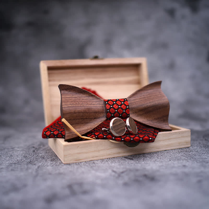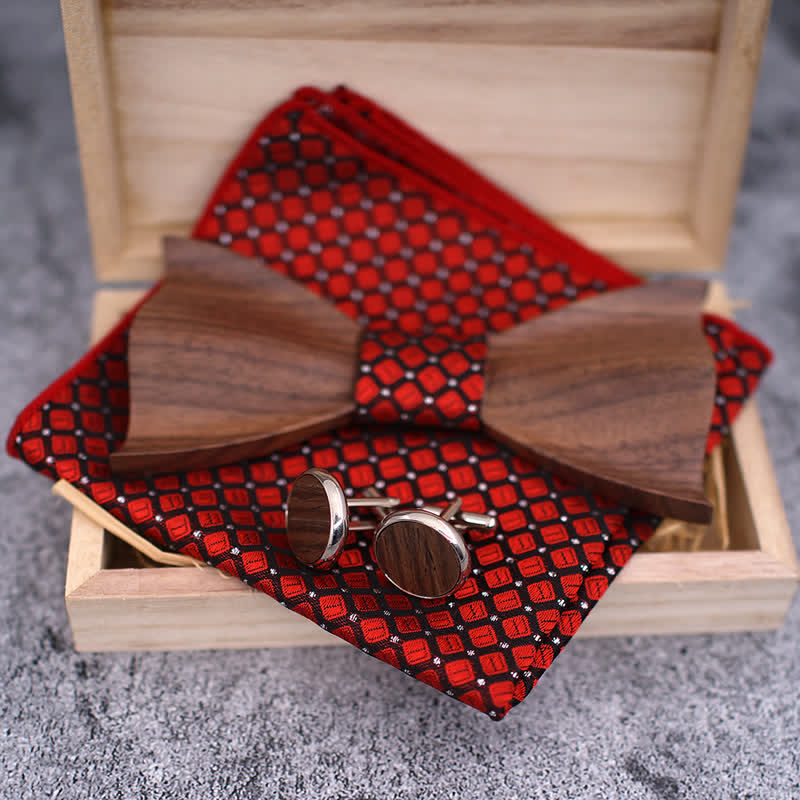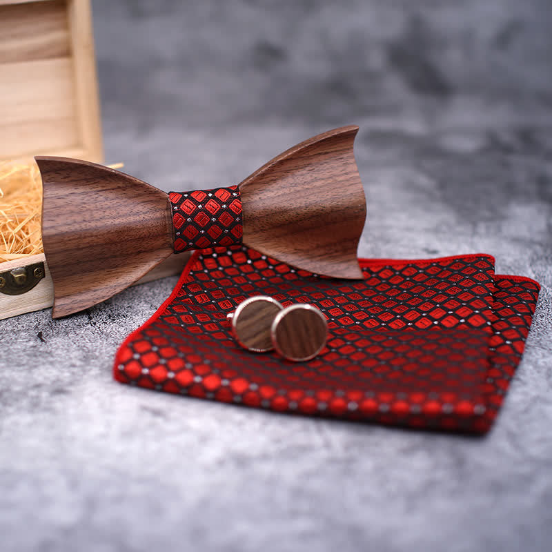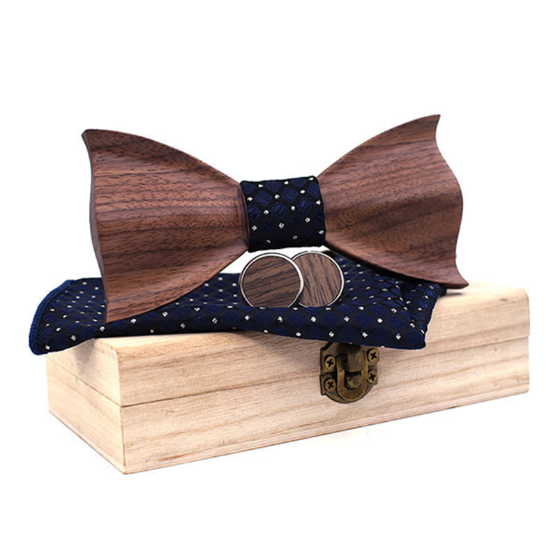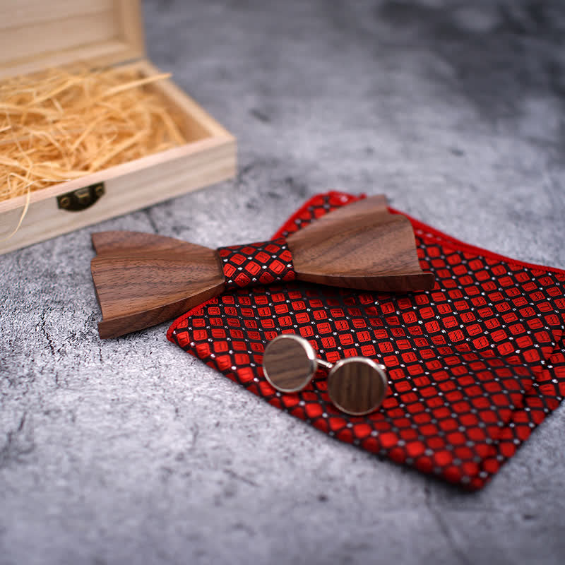 • Ensemble inclus : nœud papillon en bois x1, mouchoir et boutons de manchette avec coffret cadeau en bois.