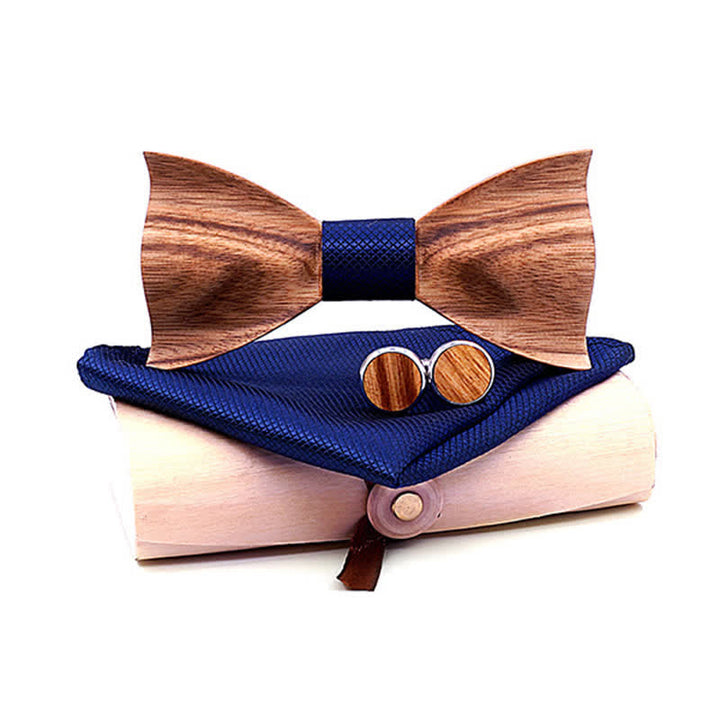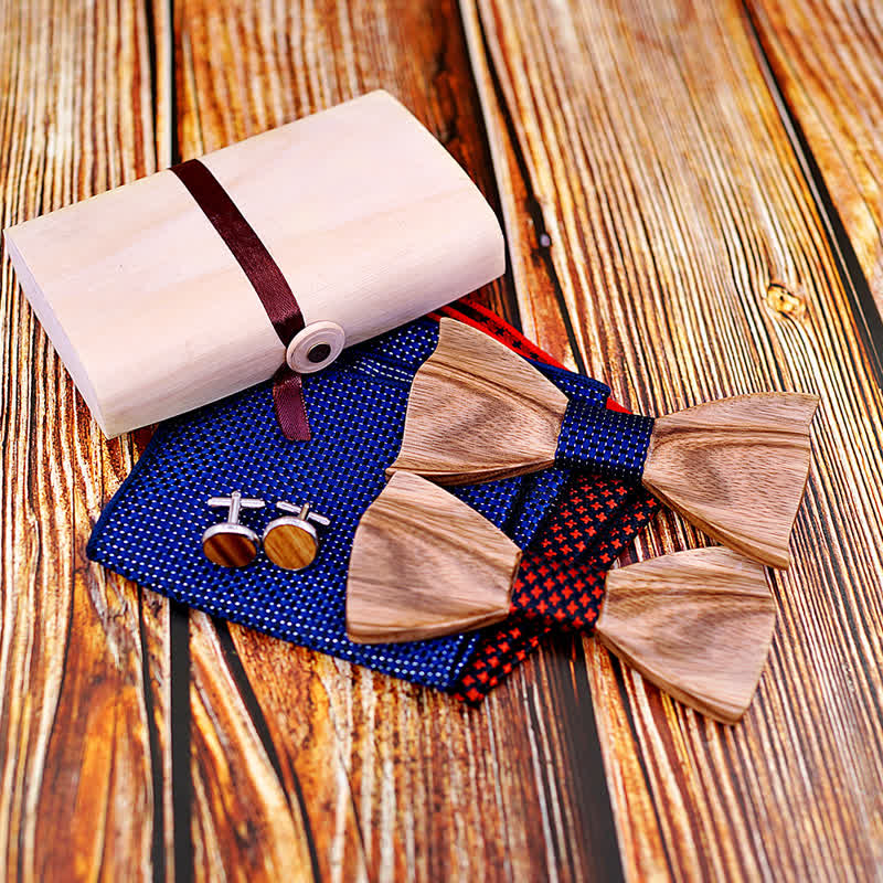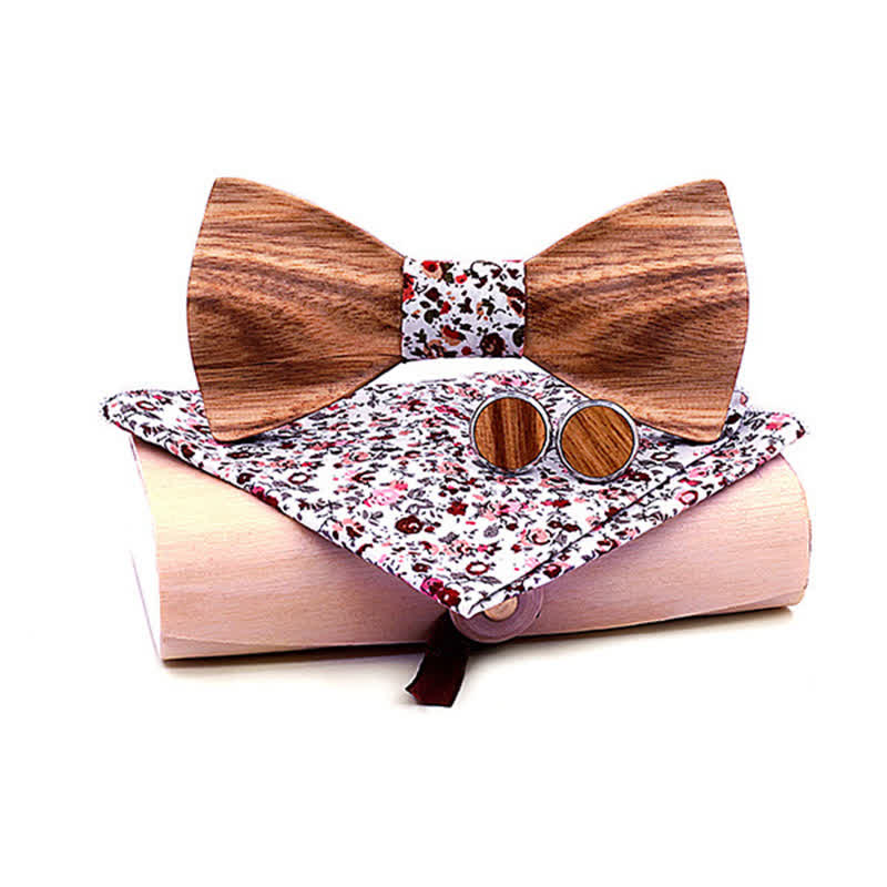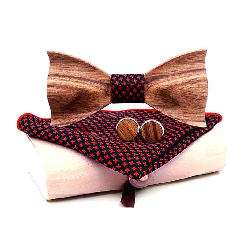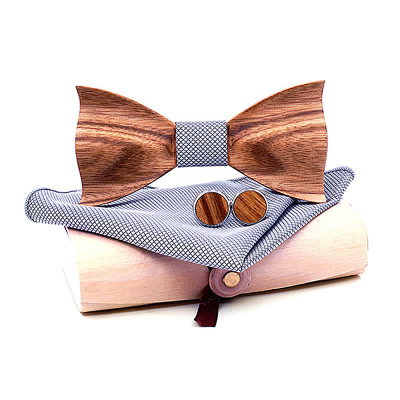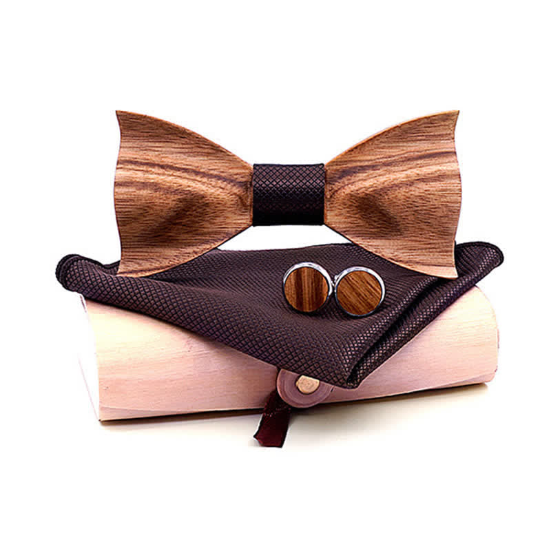 • Ce nœud papillon exclusif en bois associé à un mouchoir et une paire de boutons de manchette est une idée cadeau élégant pour homme.