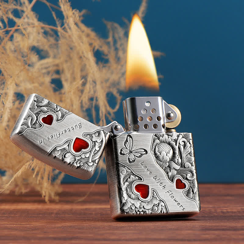 - Magnifique briquet avec une finition brossée en relief avec un design unique de papillon et de fleurs.