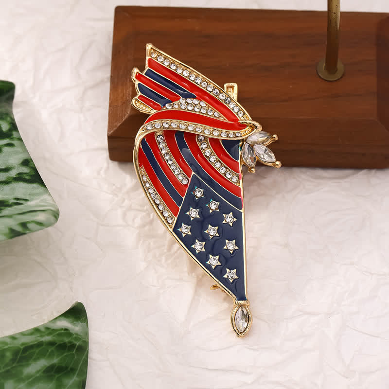 • Cette broche symbolique présente un émail rouge, bleu et blanc brillant orné de pierres précieuses scintillantes.
