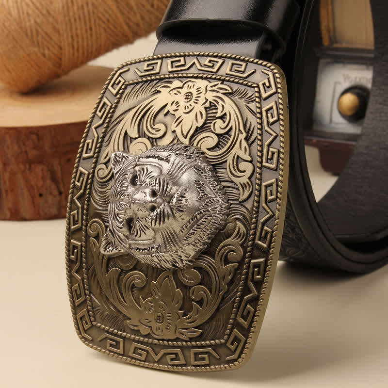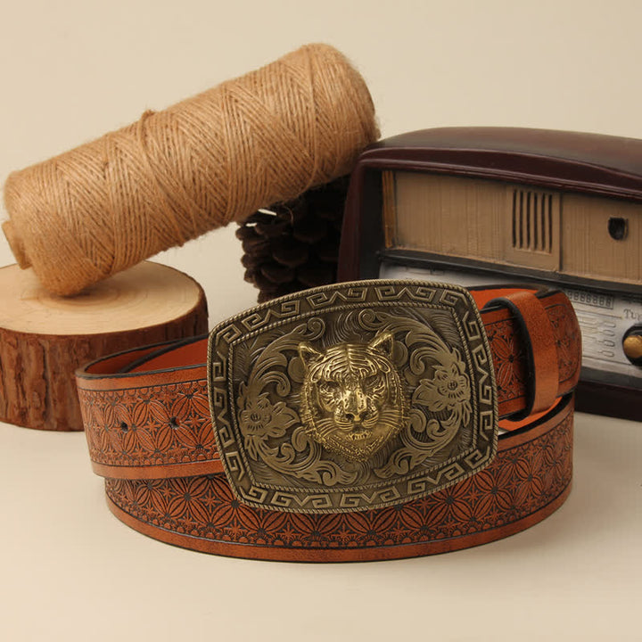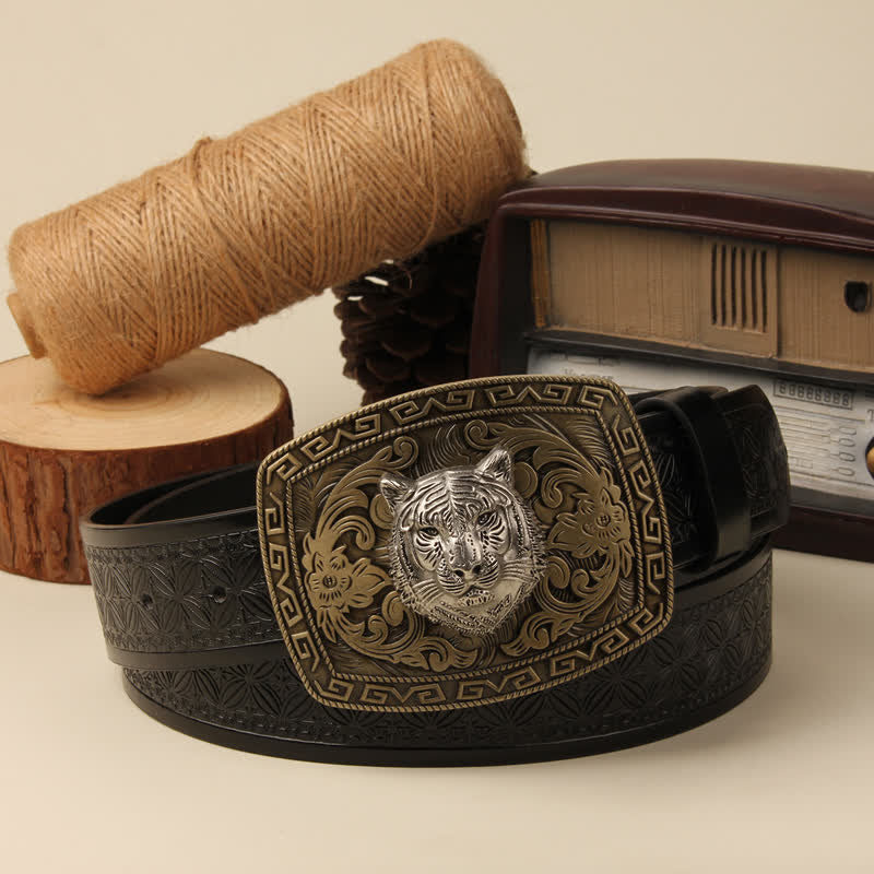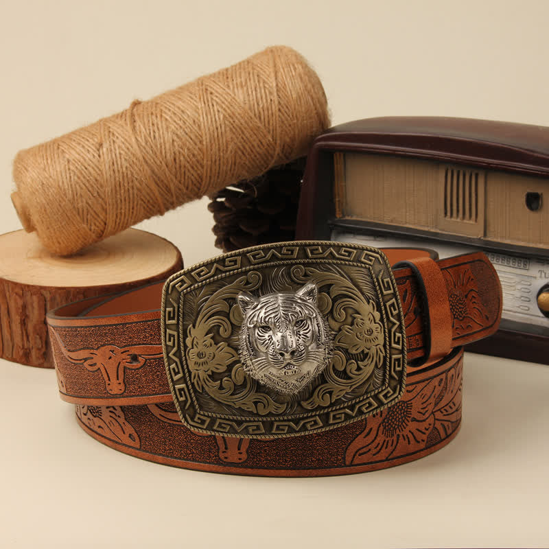 Ceinture en cuir à boucle florale sculptée avec tête de tigre pour homme