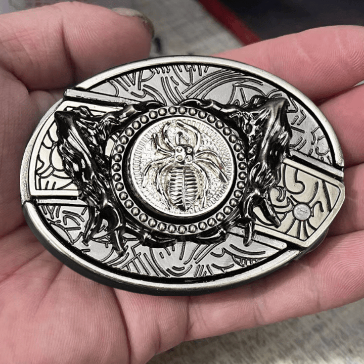 - Le centre de la boucle de ceinture coulisse facilement par simple pression pour révéler un couteau pliant fermé.