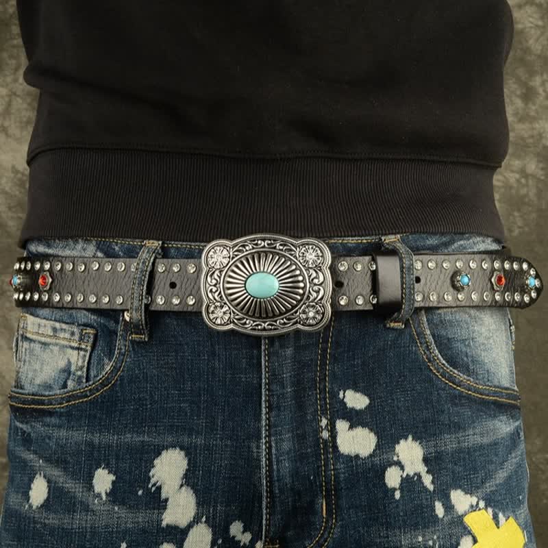 Fonctionnalité et caractère se marient dans cette ceinture western colorée ornée de pierres. Sa boucle rectangulaire en métal, ornée d'une grande pierre turquoise synthétique, offre un contraste saisissant avec la lanière en cuir neutre.