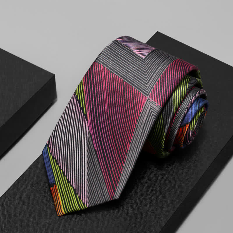 L'aspect abstrait et l'esthétique moderne dégagent une sorte de sentiment d'exaltation lointaine. Le mélange vibrant de couleurs et le design complexe incarnent l'élégance, faisant de cette cravate un accessoire exceptionnel pour toutes les occasions.