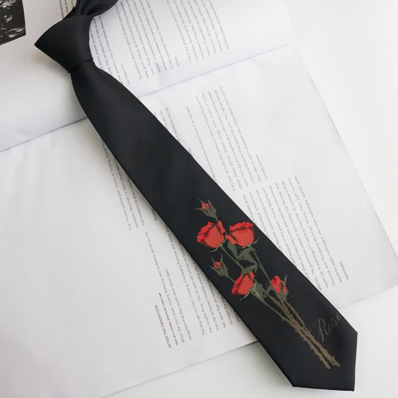 Cravate romantique noire à motif bouquet de roses rouges pour homme