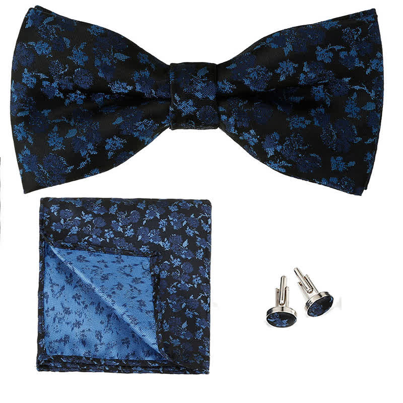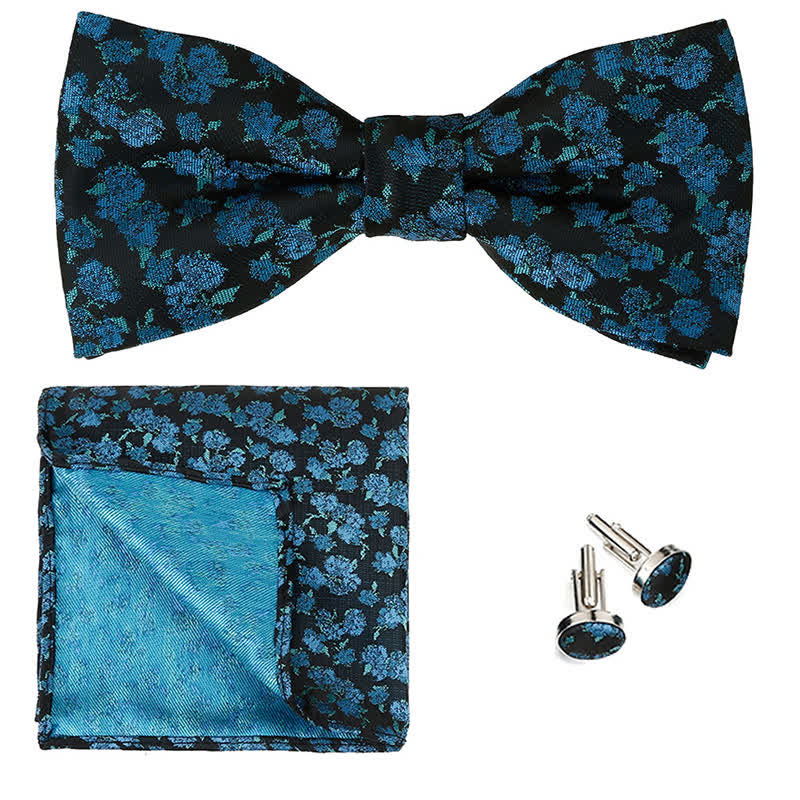 • L'ensemble nœud papillon, mouchoir et boutons de manchette assortis peut être porté de manière décontractée ou formelle.