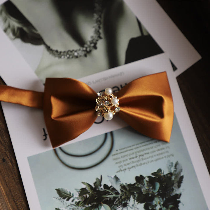 • Des fleurs dorées et des perles d'imitation blanches pures ajoutent une touche d'originalité au nœud papillon.