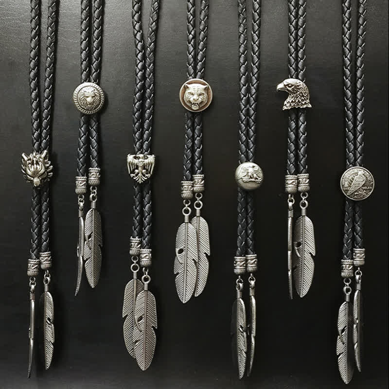 Cette cravate bolo est magnifiquement conçue avec un relief de tête d'animal sur la surface et un pendentif en forme de plume sur la pointe, vintage et élégant, vous fera paraître plus éblouissant, ajoutant une sensation plus élégante.