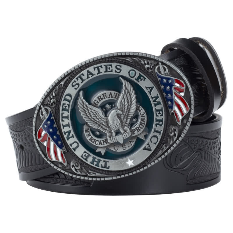 Elle est ornée d'un aigle déployé, de drapeaux américains et estampillée THE UNITED STATES OF AMERICA. La ceinture présente un design élégant et intemporel qui complète sans effort n'importe quelle tenue. Son apparence élégante et épurée ajoute une touche de sophistication à votre ensemble.