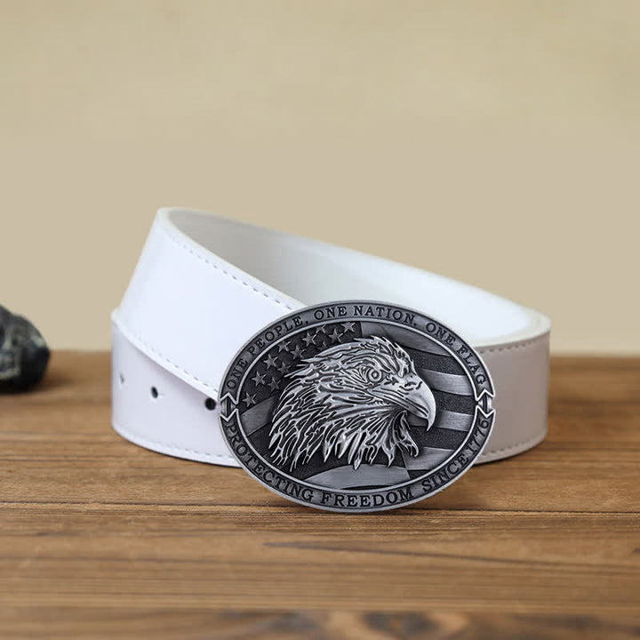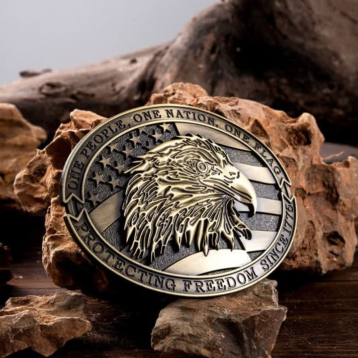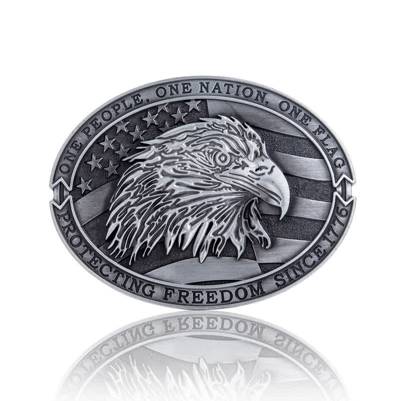 Cette boucle de ceinture de forme ovale est ornée de deux rubans patriotiques, l'un en haut et l'autre en bas : « Un peuple, une nation, un drapeau » et également « Protégeons la liberté depuis 1776 ». L'arrière-plan est le drapeau américain avec un logo central du symbole américain de la liberté : l'aigle à tête blanche.