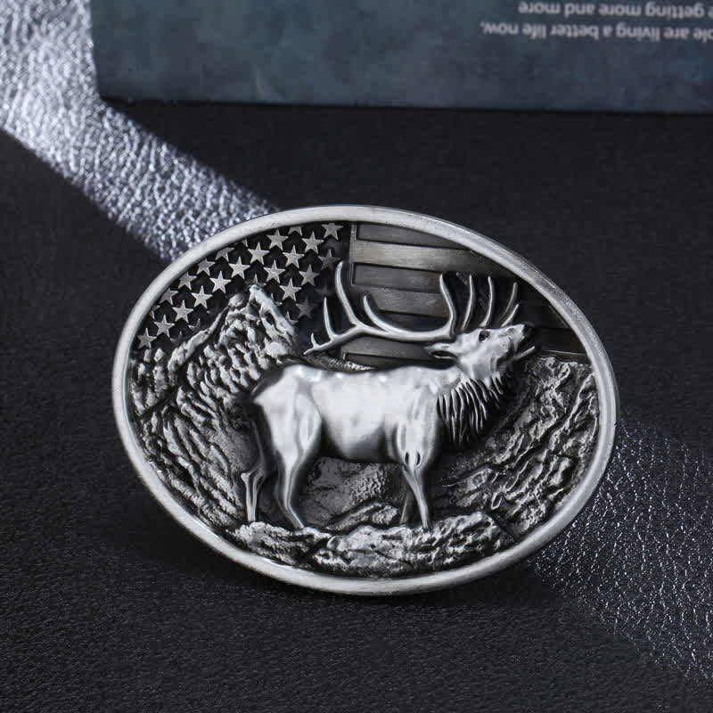 Cette boucle ovale vieillie présente une grande figure centrale représentant un énorme élan avec la tête renversée, avec un paysage montagneux accidenté et le drapeau américain faisant office d'horizon du ciel.