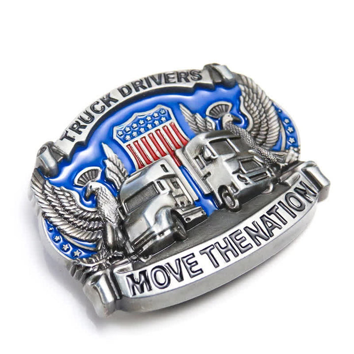 Boucle de ceinture en métal pour chauffeurs de camions déplaçant la nation d'un océan à l'autre. Lettre en étain "Truck Drivers Move The Nation", avec finition de fond en émail, belle image pressée dans la boucle qui lui donne un aspect 3D.