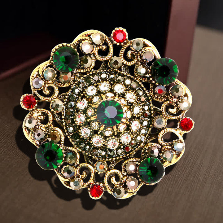 - La broche est en filigrane de couleur or, incrustée de pierres précieuses artificielles multicolores.