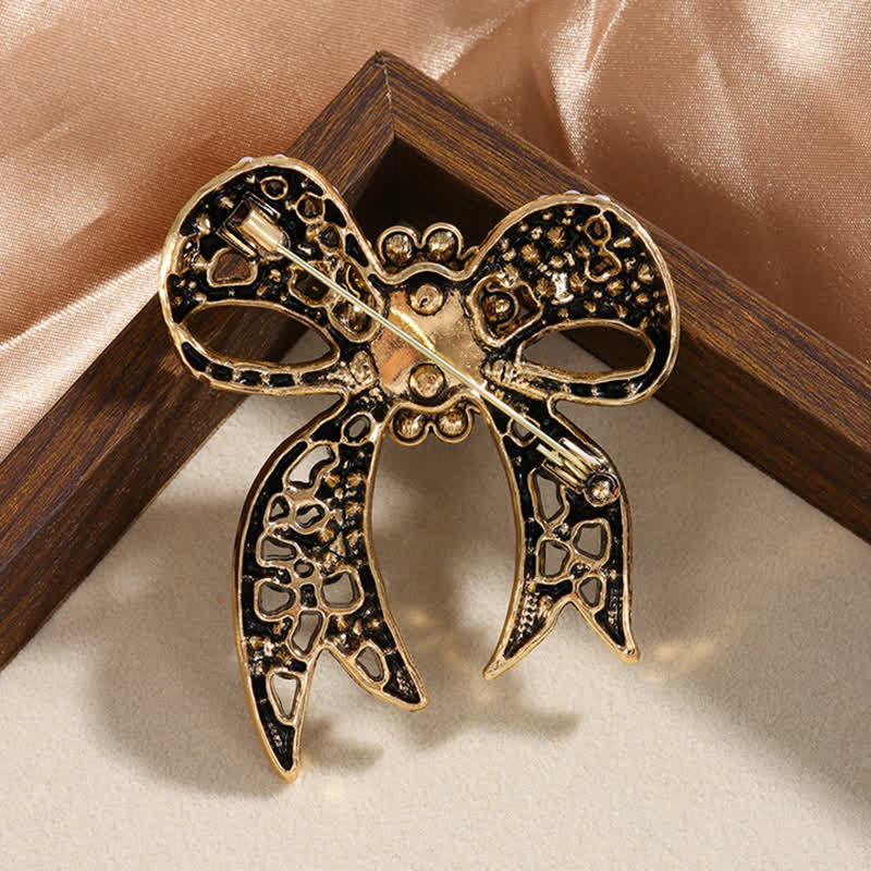 - Broche en forme de nœud avec de fausses pierres précieuses et des perles serties de strass scintillants.