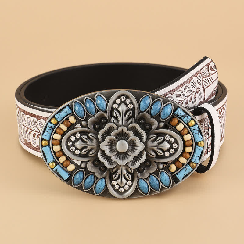 Ceinture en cuir à motif floral gaufré, ornée d'une boucle et d'une perle turquoise et d'une pierre rouge rétro